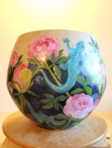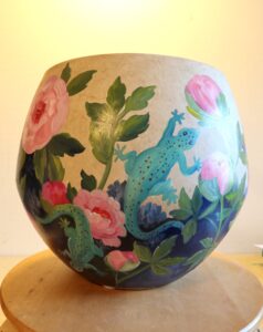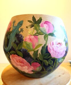 Oil painted flower pot. Pictures from each side of the vase.